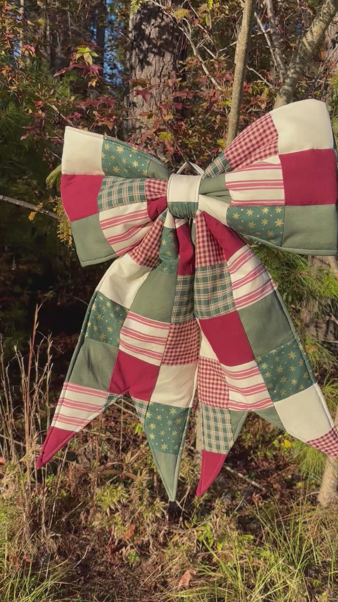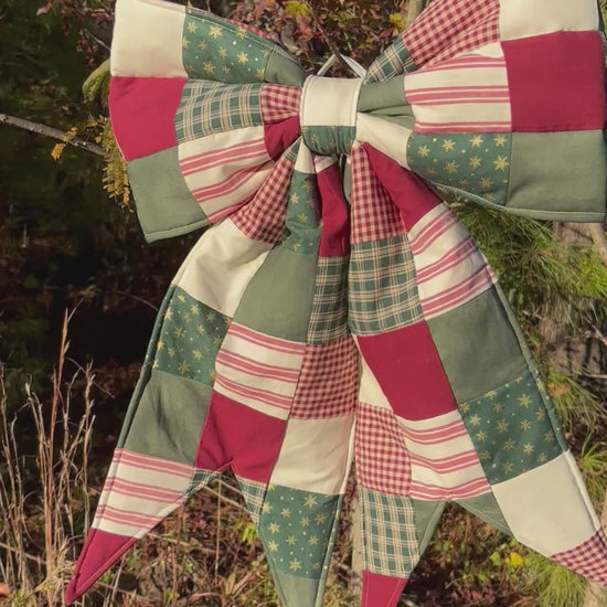 handcrafted reworked quilt bow —each bow carries fragments of a story — quilts that once warmed homes, now reimagined into lasting keepsakes, a true one-of-a-kind creation. This is functional art for your home!