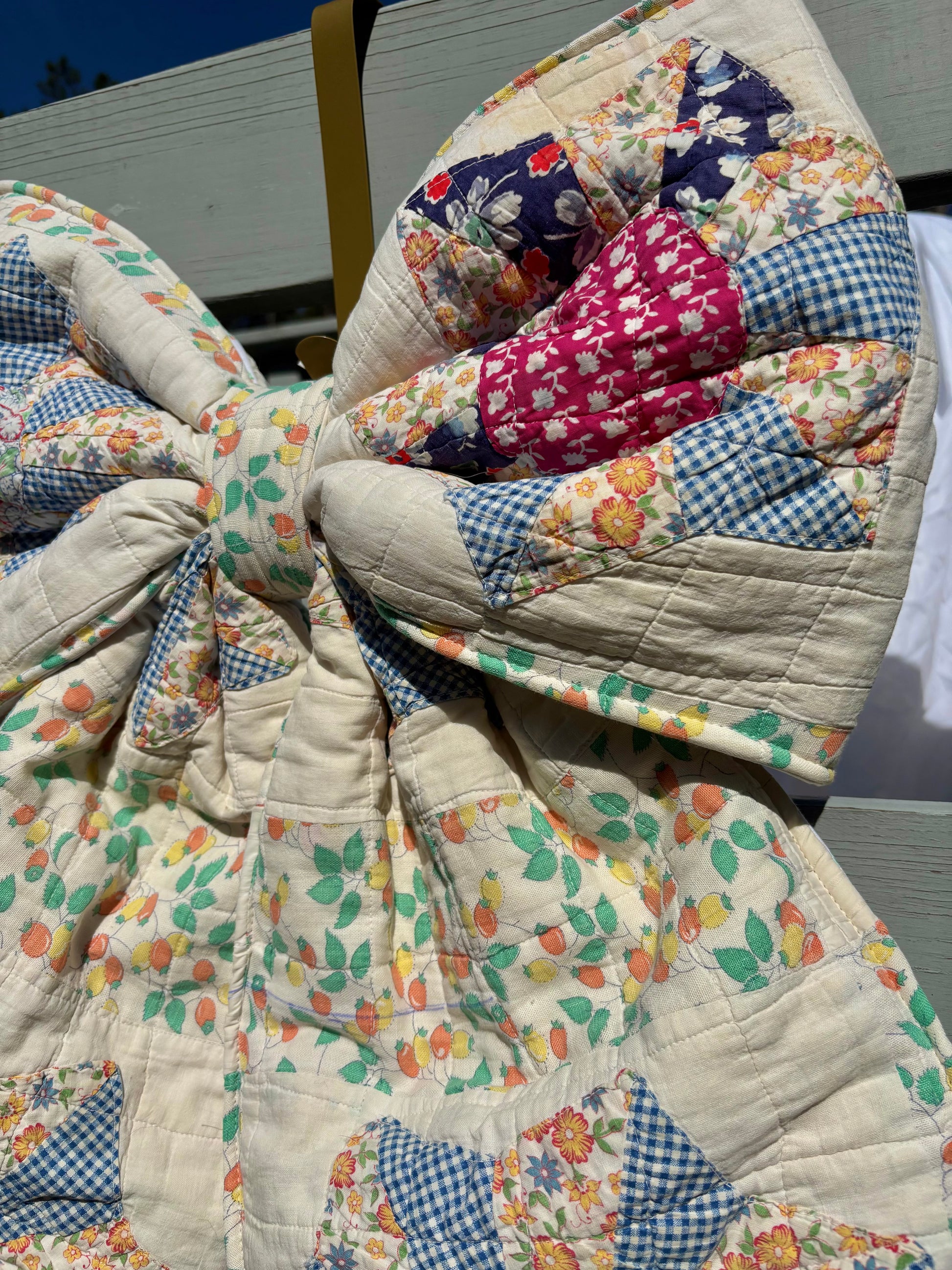 handcrafted reworked quilt bow —each bow carries fragments of a story — quilts that once warmed homes, now reimagined into lasting keepsakes, a true one-of-a-kind creation. This is functional art for your home!